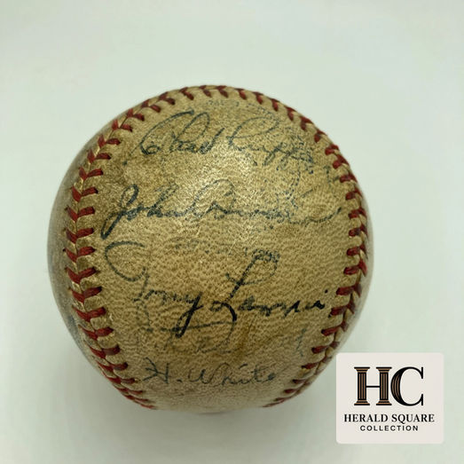 1935 New York Yankees Team Signed Official American League Harridge Game Baseball. 14 signatures with Lou Gehrig, Lefty Gomez, Joe Sewell, Red Ruffing, Tony Lazzeri and others. Comes with full letter PSA DNA COA and a full letter JSA COA.